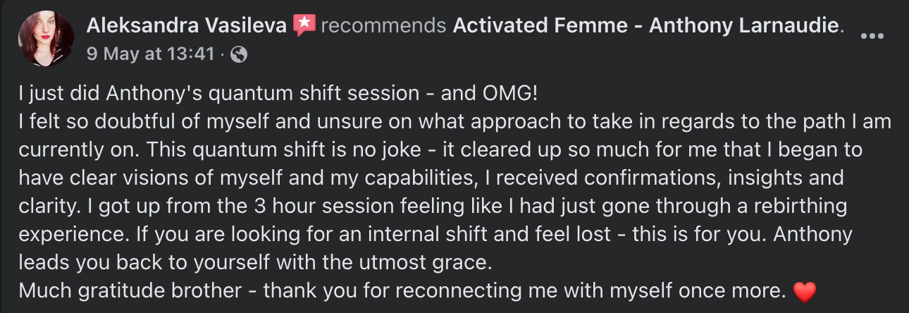 A personalized energetic breathwork, somatic practice and quantum healing to recalibrate your entire system so that you can release blocages and stored emotions you have been carrying.